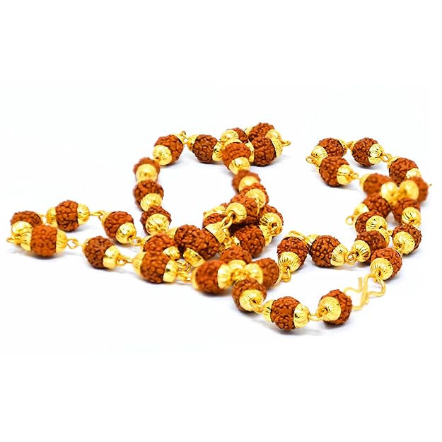 Golden Cap Rudraksha Mala (108+1 Beads) – Original 5 Mukhi Himalayan Rudraksha Mala with Authenticity Certificate | Handmade Spiritual Japa Mala for Meditation & Pooja