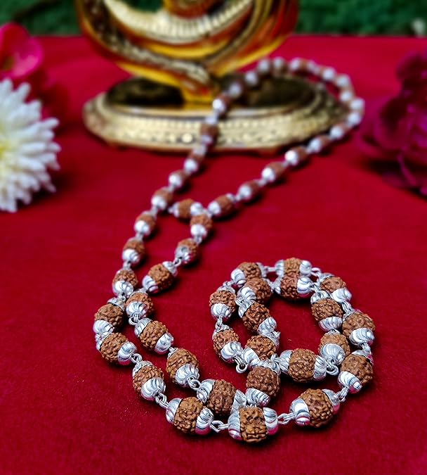 This Authentic Silver-Capped Panchmukhi Rudraksha Mala is a blend of spirituality and craftsmanship. Each of the 54+1 beads (Guru bead) is made from genuine Himalayan Rudraksha seeds and individually fitted with hand-polished German silver caps for added protection and aesthetic appeal.